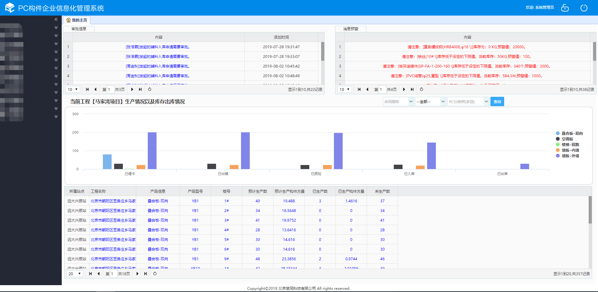 慧同科技面向远大兴辰构件企业专业定制的“PC构件企业信息化管理系统”可以很好的实现构件企业信息化管理,功能全方位覆盖了PC构件企业业务流程的多个方面,提供集客户、项目、经营、生产、质量、材料试验、混凝土试验、构件试验、采购、仓库、人力、财务、多维报表在内的全集成的企业级全面信息化系统。